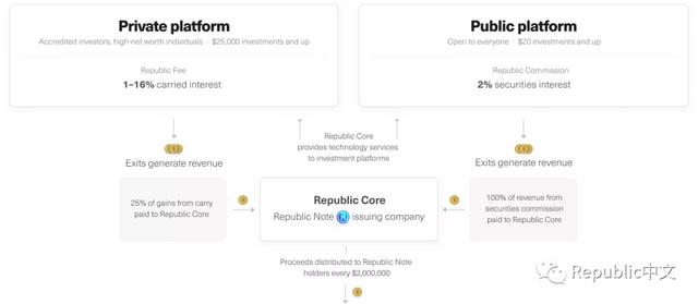 作为一种合规的证券型代币,Republic Note 可以分享平台的部分收益。当有平台募资项目成功退出的时候,Republic 会将其中的附带权益(carried interest)变现,用来给持有 Republic Note 的投资人分红。