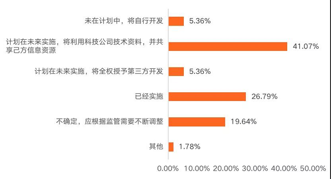 在国有大型银行和股份制商业银行头雁效应的带动下,越来越多的中小银行加入到核心技术的建设和升级改造的工程中。除很少一部分城商行和农商行自主开发外,大部分中小行选择与金融科技公司合作。根据《中小银行金融科技发展研究报告2021》问卷数据显示,73.22%银行(注:数据为“计划在未来实施,将利用客户公司技术资料,并共享己方信息资料”、“计划在未来实施,将全权授予第三方开发”和“已经实施”三项数据加总)已经或者计划将与科技公司展开核心技术合作(注:详见图2)。