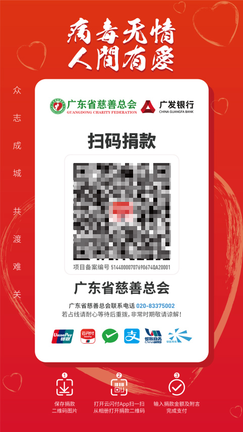 新型冠状病毒感染的肺炎疫情牵动人心!病毒无情,人间有爱!广东省慈善总会为应对本次疫情,联合中国银联及广发银行铺设了抗击“新型冠状病毒肺炎”疫情的捐款渠道。