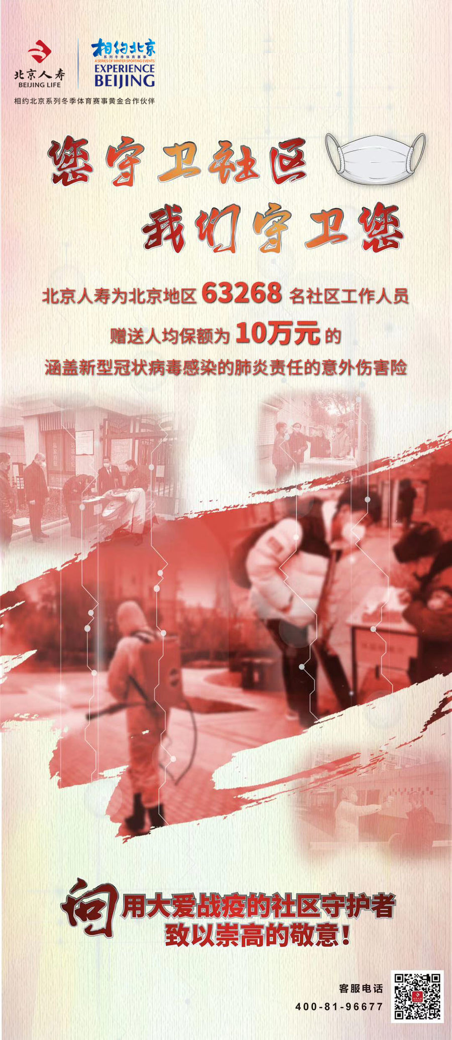 这是一场没有硝烟的防疫战,因为我们拥有无畏的勇气,所以我们也拥有必胜的决心。北京人寿也将全力以赴支持奋斗在抗疫一线的战士们,为守护生命筑起阻隔疾病的堡垒,向用大爱“战疫”的社区守护者们提供我们最专业与擅长的帮助,送上我们亲人般的服务,您守护社区,让我们来守护您!